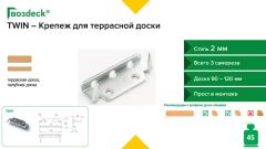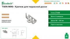 Разновидность Крепежа Твин Мини используется как скрытый крепежный элемент для тонких деревянных настилов. По сравнению с крепежом Твин низкую имеет меньший монтажный зазор между террасными досками, менее заметен.