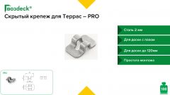 Гвозdeck ПРО – универсальный скрытый крепеж для любых деревянных конструкций, в том числе для конструкций из твердых пород древесины. Изготовлен из стали толщиной 2мм с защитным цинк-ламельным покрытием, применяется при монтаже террасной и палубной доски.