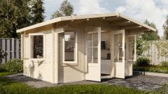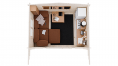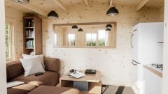 Садовый дом № 10 - конструкция классической формы с двухскатной крышей. Общая площадь 9,9 кв.м. позволяет с комфортно и функционально обустроить внутреннее пространство. Три понорамных окна и остеклённые двери создают естественное освещение помещения, что делает внутренную атмосферу приятной и уютной. Дополнительно усовершенствовать конструкцию можно террасой, которую будет накрывать широкий свес входной группы.