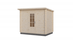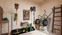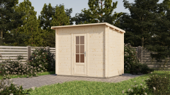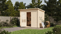 Хозблок № 4 - компактное сооружение площадью 4,6 кв.м. с односкатной крышей и одностворчатой остекленной дверью. Использовать пространство можно как светлую кладовку, место для хранения инвентаря и инструмента, установки пары компактных стеллажей.