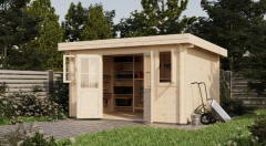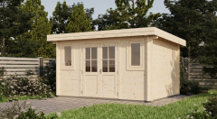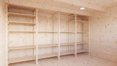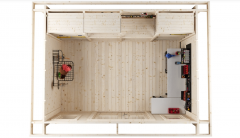 Односкатная кровля, два фронтальных окна и широкие распашные двери с остеклением создают в хозблоке 4,4х3,3 м просторное и уютное помещение. Общая площадь 10,1 кв.м. позволяет удобно использовать пространство для хранения нужных предметов, инструментов и инвентаря.