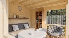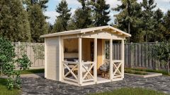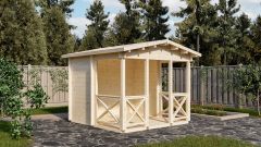 Сочетает в себе 2 зоны отдыха: открытую и закрытую. Одна половина представляет собой открытое пространство с ограждением - идеальное место для отдыха на свежем воздухе. Вторая половина - уютная закрытая с трех сторон часть, обеспечивающая защиту от ветра и непогоды. Двускатная кровля придает беседке эстетичный вид и надежно защищает от осадков.