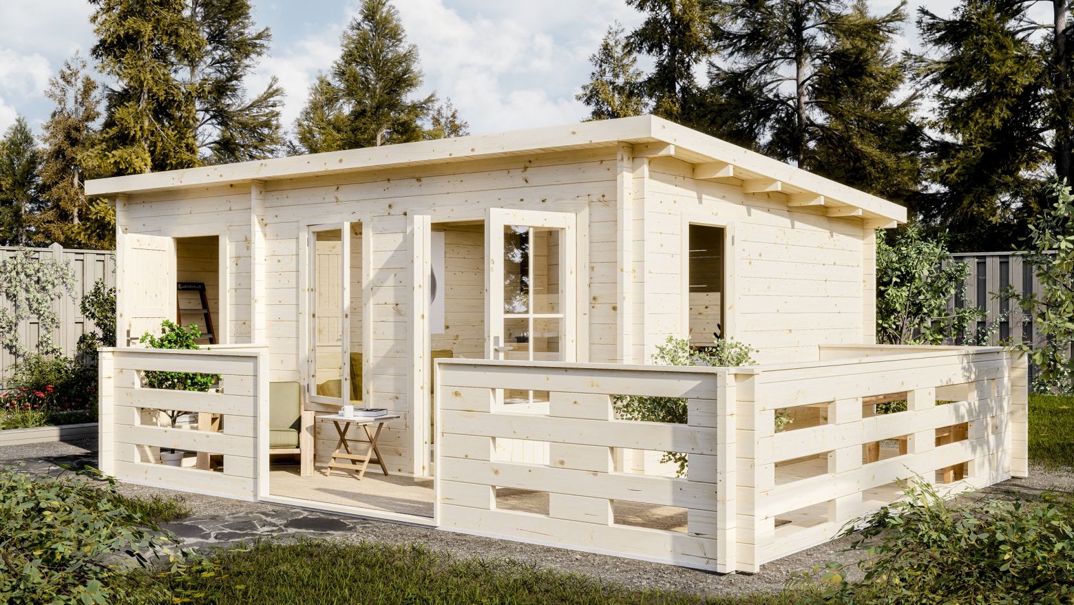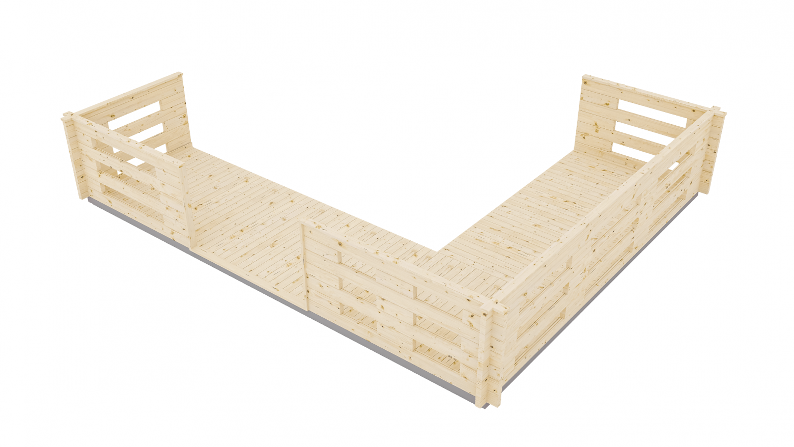 Терраса угловая - малое дополнительное архитектурное сооружение увеличивающее полезную площадь садовых домов и беседок. Создаёт комфортное открытое пространство для отдыха на свежем воздухе. Подходит к садовым домам с длиной по центральному фасаду от 3 до 6 м. Напольное покрытие из террасной доски профиль "Вельвет" 28х142 мм. Вход по длинной стороне шириной 160 см. Высота ограждения террасы 96 см. Конструктив ограждения с проветриванием и допуском солнечного света.