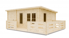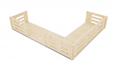 Терраса угловая - малое дополнительное архитектурное сооружение увеличивающее полезную площадь садовых домов и беседок. Создаёт комфортное открытое пространство для отдыха на свежем воздухе. Подходит к садовым домам с длиной по центральному фасаду от 3 до 6 м. Напольное покрытие из террасной доски профиль "Вельвет" 28х142 мм. Вход по длинной стороне шириной 160 см. Высота ограждения террасы 96 см. Конструктив ограждения с проветриванием и допуском солнечного света.