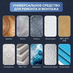 Применяется для чистового приклеивания декоративных элементов, плинтусов, стекла, цветной керамики, пластиковых стеновых панелей к ДВП, ДСП, OSB, ПВХ, ГКЛ, бетонным, каменным, керамическим, деревянным и оштукатуренным поверхностям.