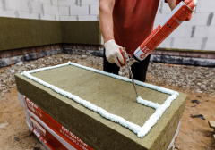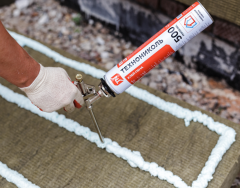 Клей-пену наносят на обеспыленные основания. Для лучшей адгезии рекомендуется предварительно увлажнить рабочую поверхность.