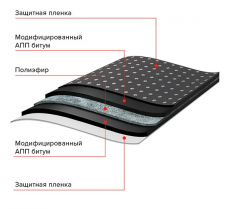 Материал производится путем пропитки основы из полиэфира битумным вяжущим с добавлением АПП полимеров. Верхний и нижний слой защищен полимерной, несъемной, легкоплавкой пленкой с рисунком.