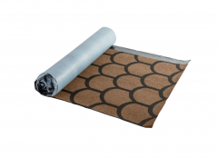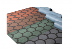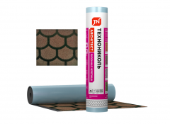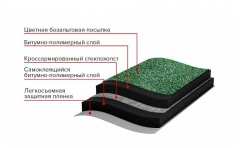 Верхнее покрытие материала – цветной базальт и минеральная цветная посыпка в форме рисунка, нижнее покрытие – силиконизированная съемная пленка. С верхней стороны материал имеет продольную битумную полосу, защищенную силиконизированной съемной пленкой.