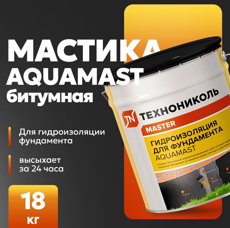 Мастика битумная AquaMast — полностью готовый к применению материал на основе нефтяного битума, содержащий технологические добавки, минеральные наполнители и растворитель. Применяется для защиты от влаги фундамента и конструкций, заглубленных в грунт и контактирующих с влажной средой.