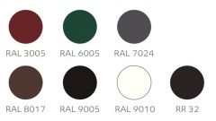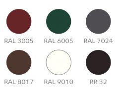 Водосточная система Foramina круглого сечения изготавливается в цветах: PUR: RAL 3005 - красное вино, RAL 6005 - зеленый, RAL 7024 - серый графит, RAL 8017 - коричневый, RAL 9010 - белый, RR32 - коричневый, PURMAN двусторонний 50/50 мкм (D125/100): RAL 9005 - черный темный.