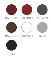 Водосточная система прямоугольного сечения МП Бюджет изготавливается в цветах: RAL9003 - белый, RAL8017 - коричневый, RAL 7024 - серый графит, RAL3005 - красное вино, RAL3011 - коричнево-красный, Zn.